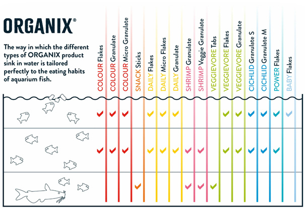Op de afbeelding zie je al het Organix voer, en of het geschikt is voor bewoners uit de bovenste, middelste en/of onderste waterlaag van het aquarium.