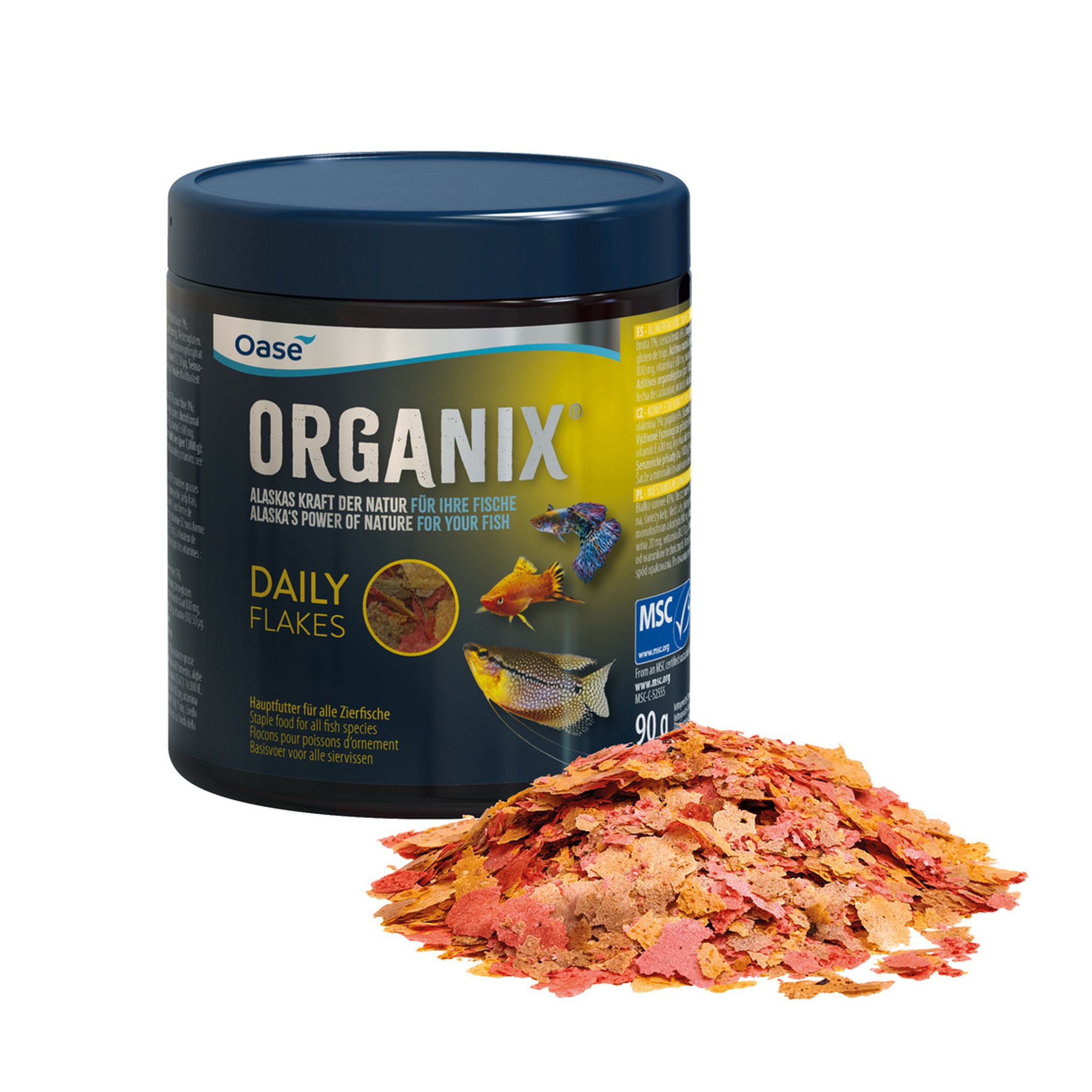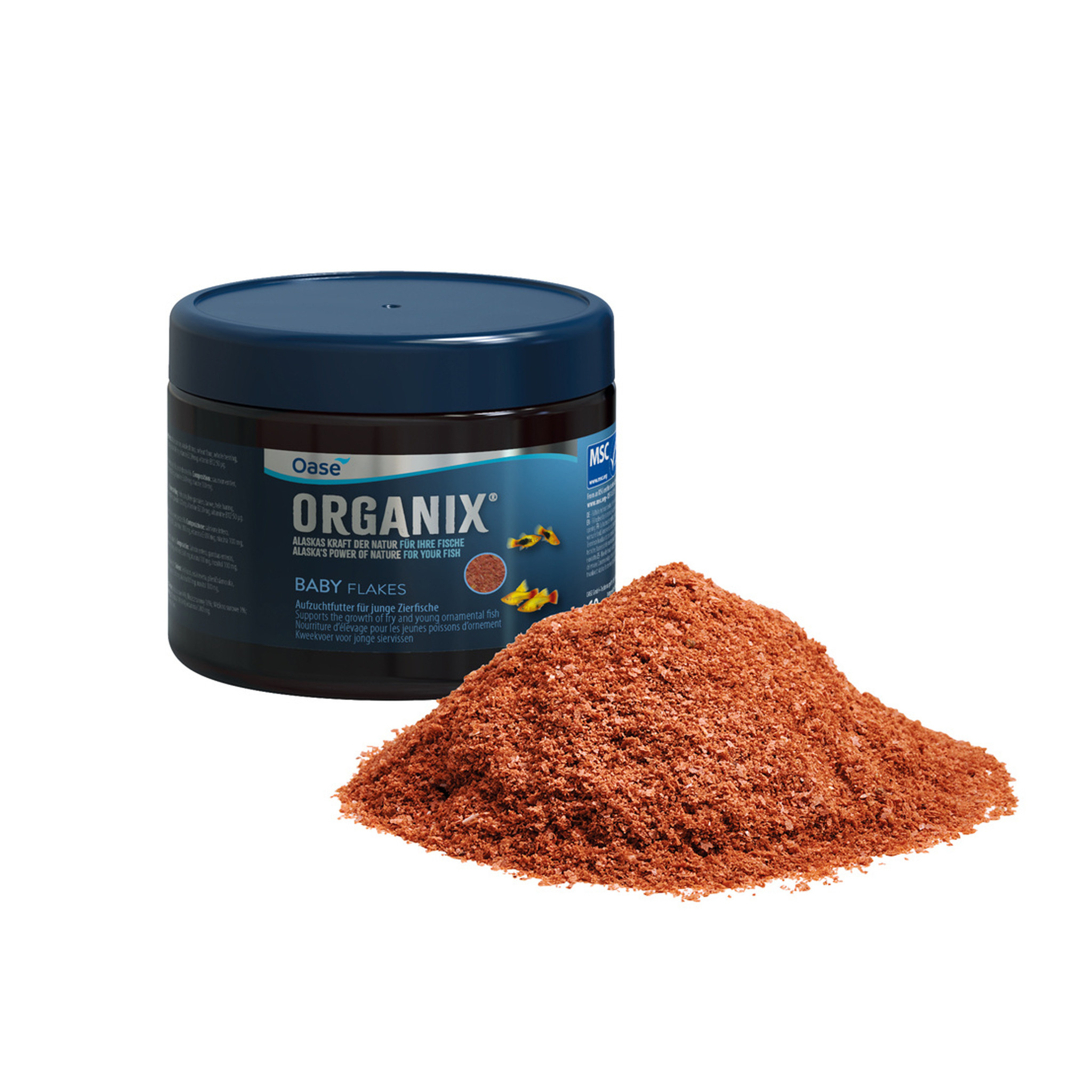 Zoals je eerder gelezen hebt, heeft Oase Organix voeding voor kleine volwassen vissen (Daily Micro Flakes en Micro Colour Granulate). Speciaal voor jonge vissen is Baby Flakes ontwikkeld, dit blijft bovenin het aquarium drijven en bevorderd de groei die babyvissen doormaken. In deze periode is goede voeding van groot belang!